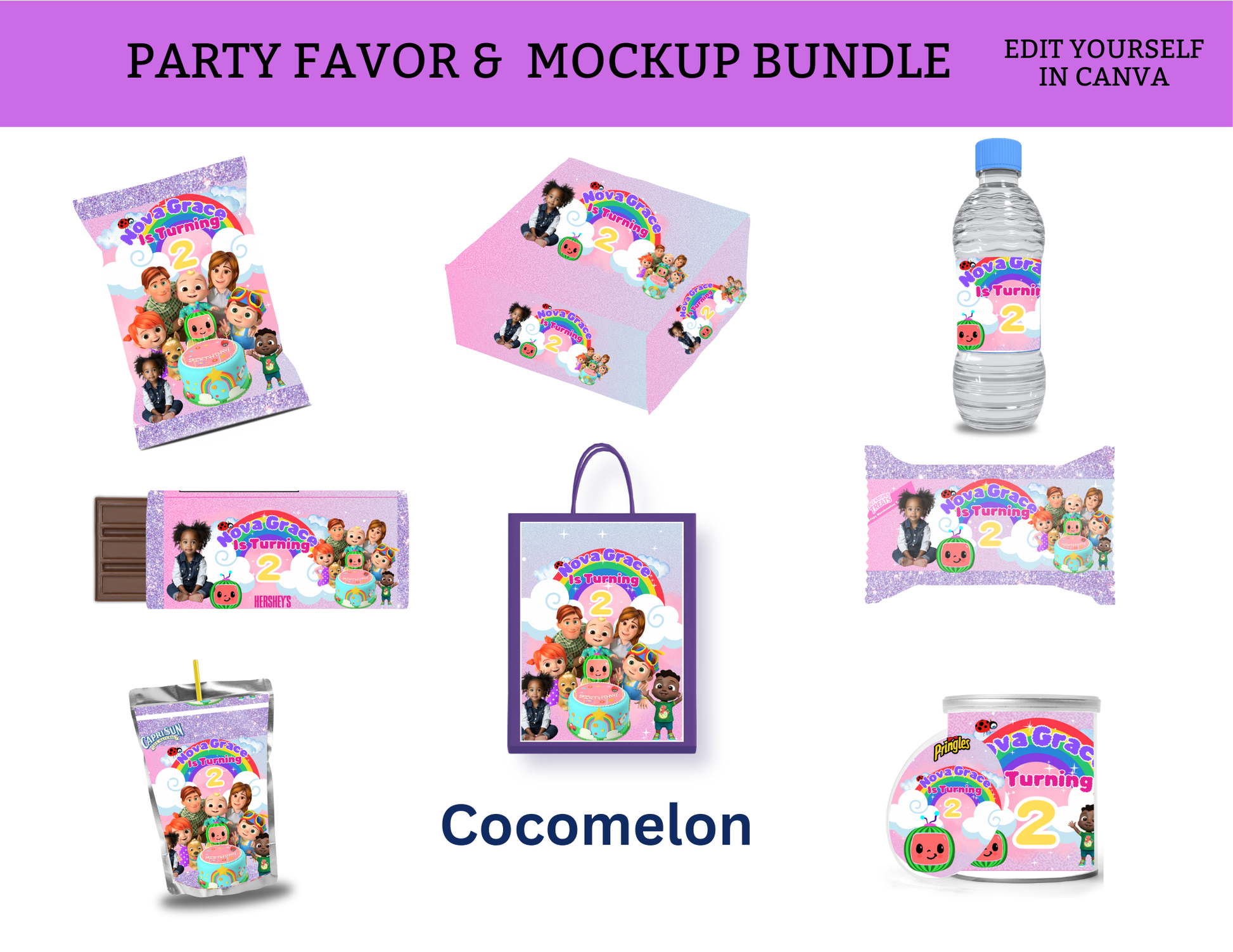 Bring the beloved characters of CocoMelon to life with this Coco-Melon 8-Template Party Favor Bundle! With vibrant colors, fun characters, and customizable options, your CocoMelon-themed event will be a hit with guests of all ages.