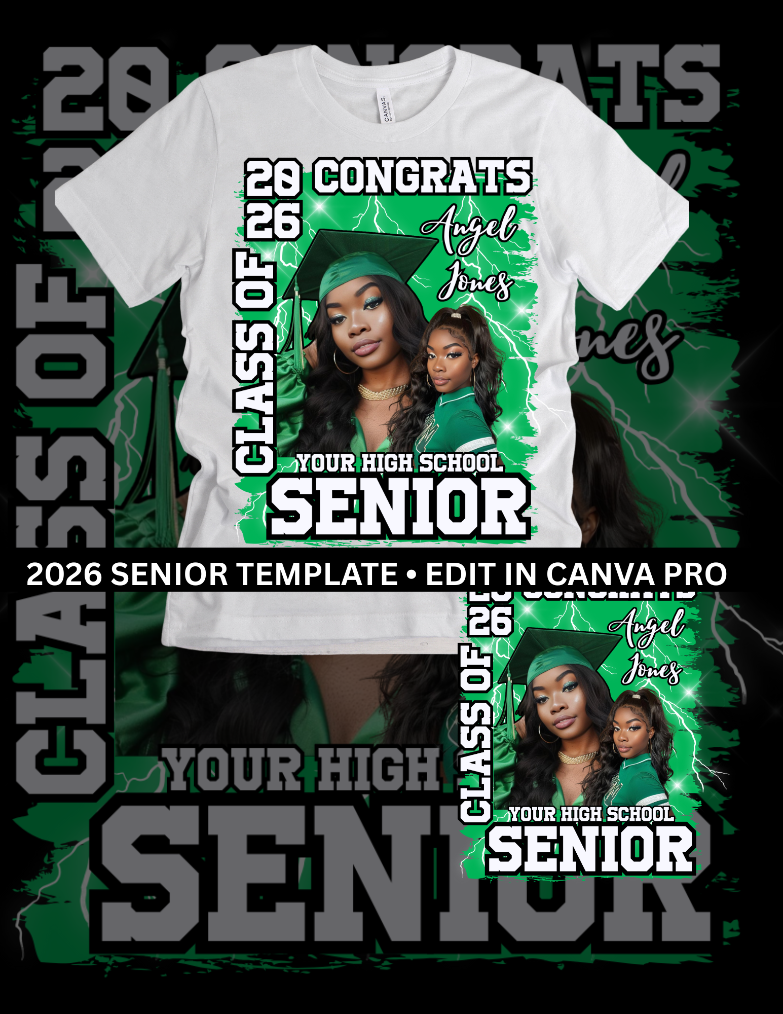 This Congrats Senior 2026 t-shirt template is perfect for celebrating graduation season. Easily edit inside Canva Pro to personalize wording, colors, and layout for your graduate or customers.