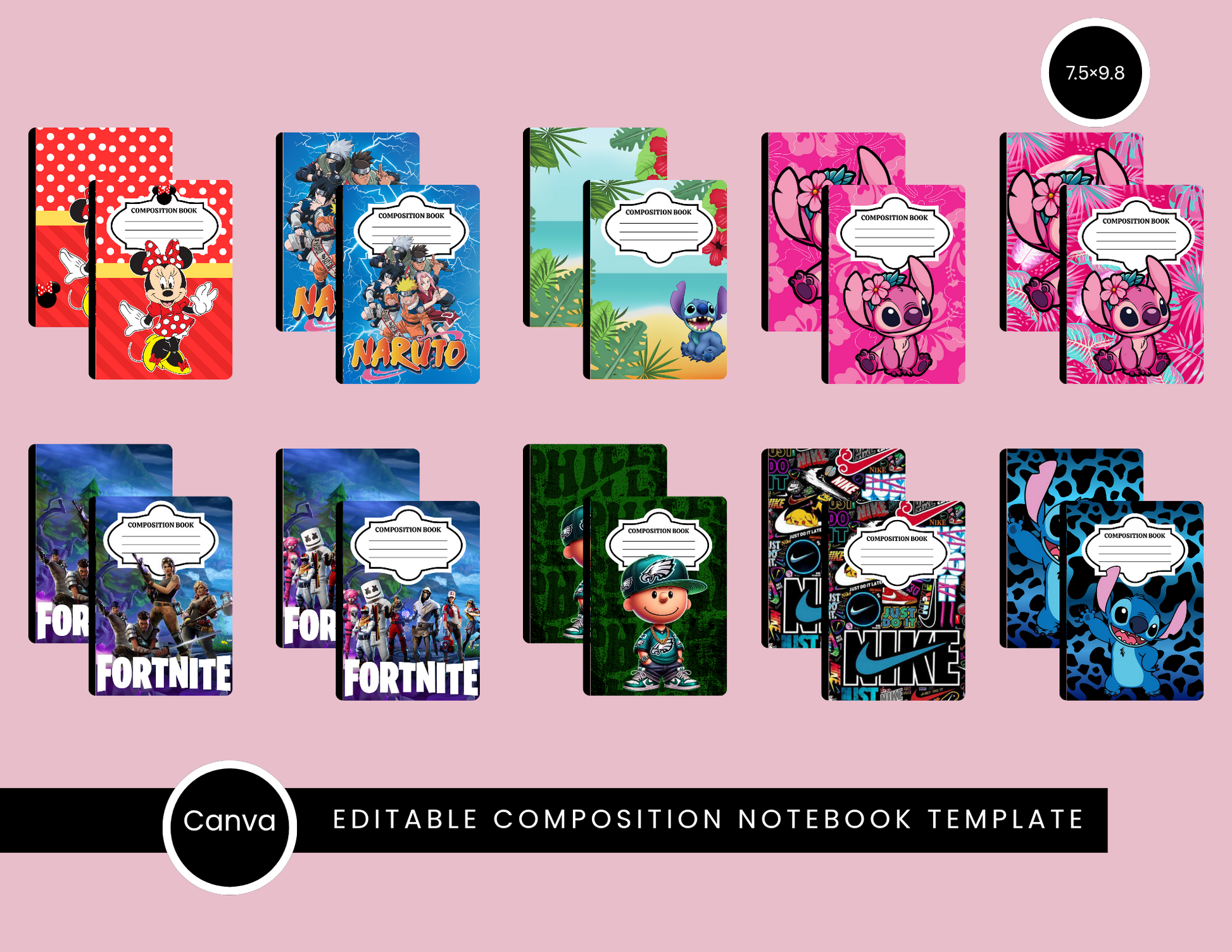 Editable 10-Template Character & Sports Composition Notebook Cover Bundle – Canva Pro Required