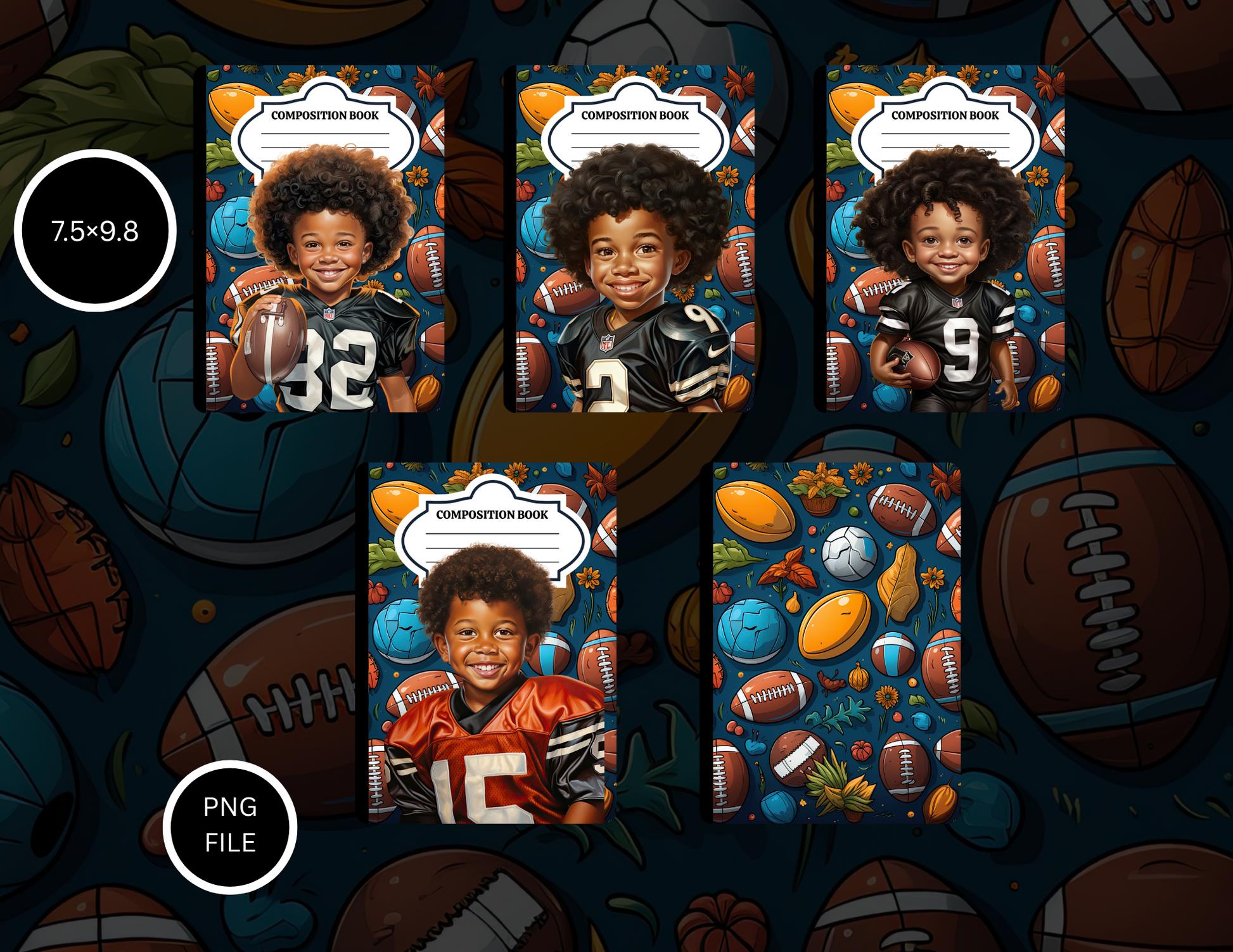 Football Star Boy Composition Notebook Covers – 5 PNG Designs