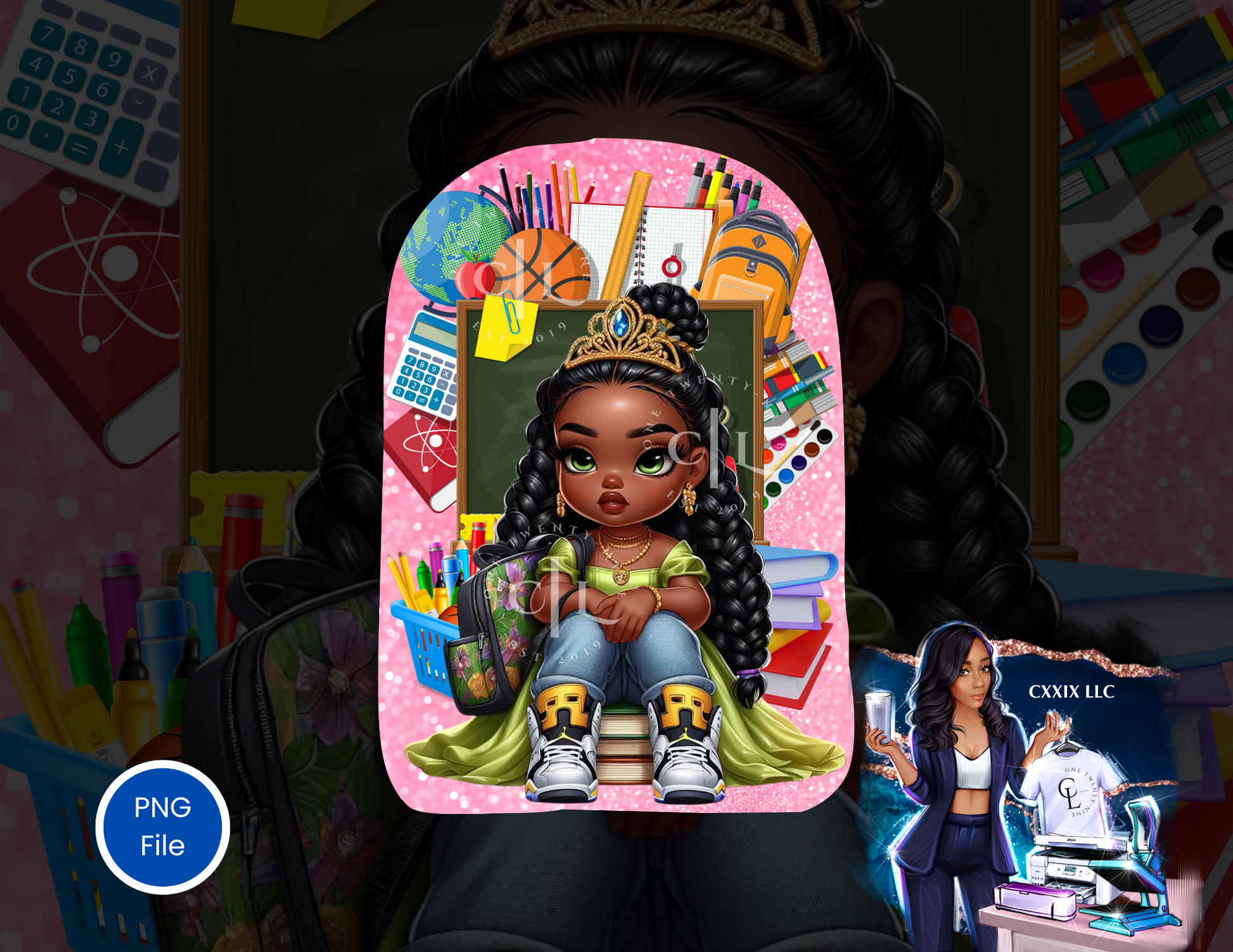 This Black girl is giving boss energy with her braids, crown, and fierce school vibe. Use this PNG for bookbags, matching pouches, and more.
