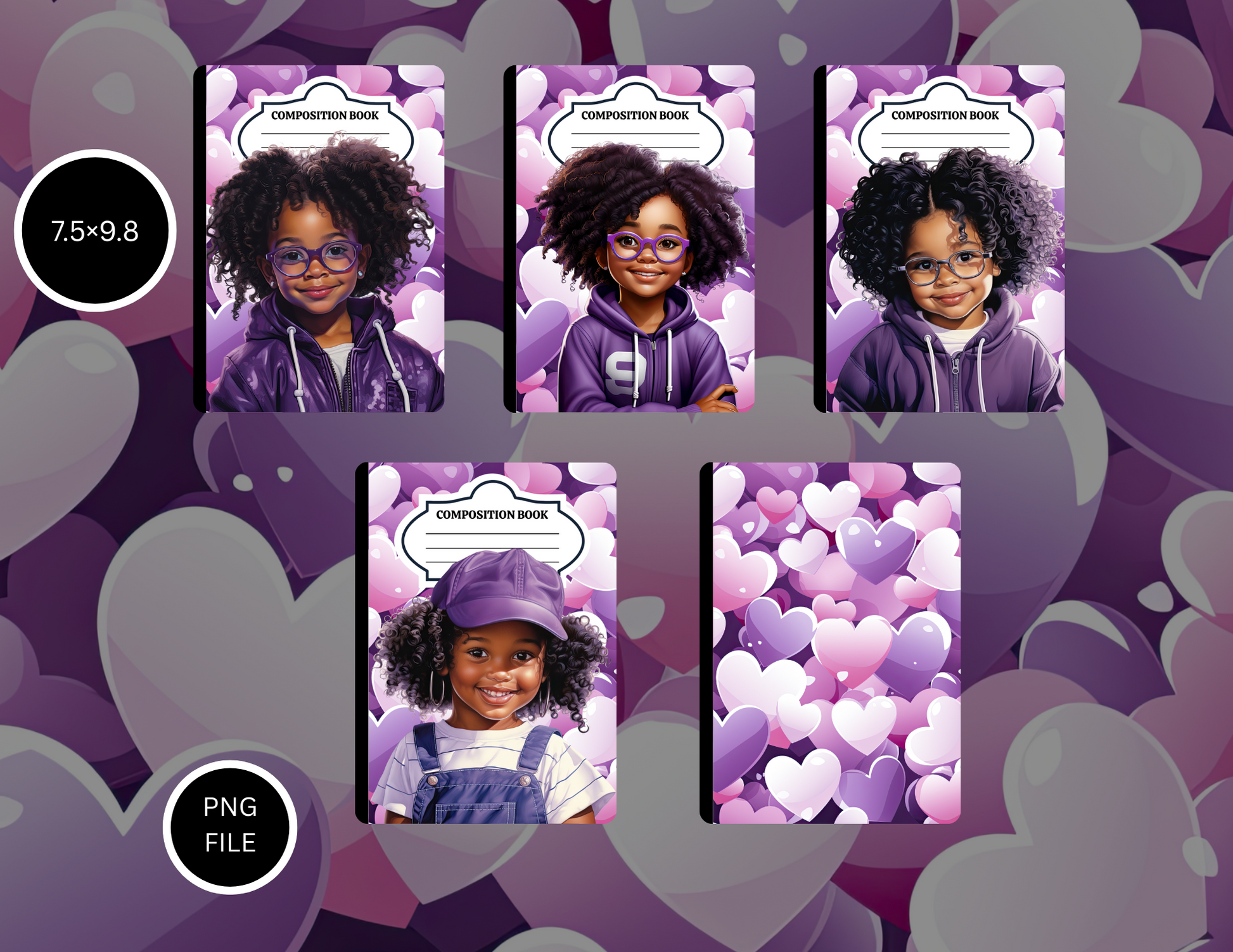 Purple Heart Girl Composition Notebook Bundle – 5 PNG Designs