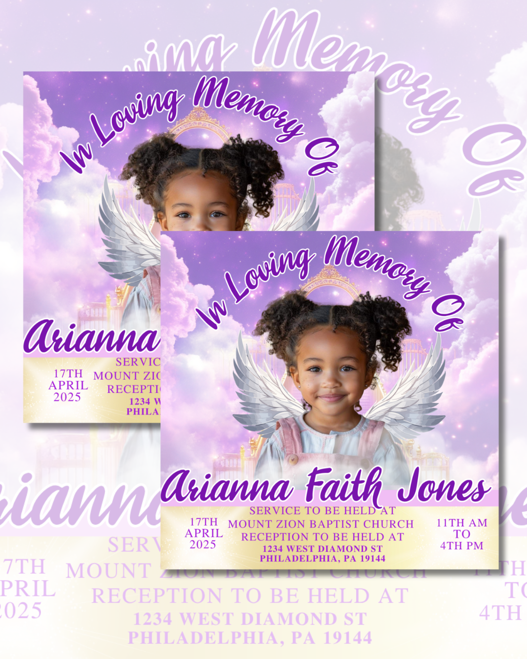 Create a professional Purple & Gold Funeral Card with this editable Canva Pro template. Personalize with names, dates, and service details for memorial keepsakes.