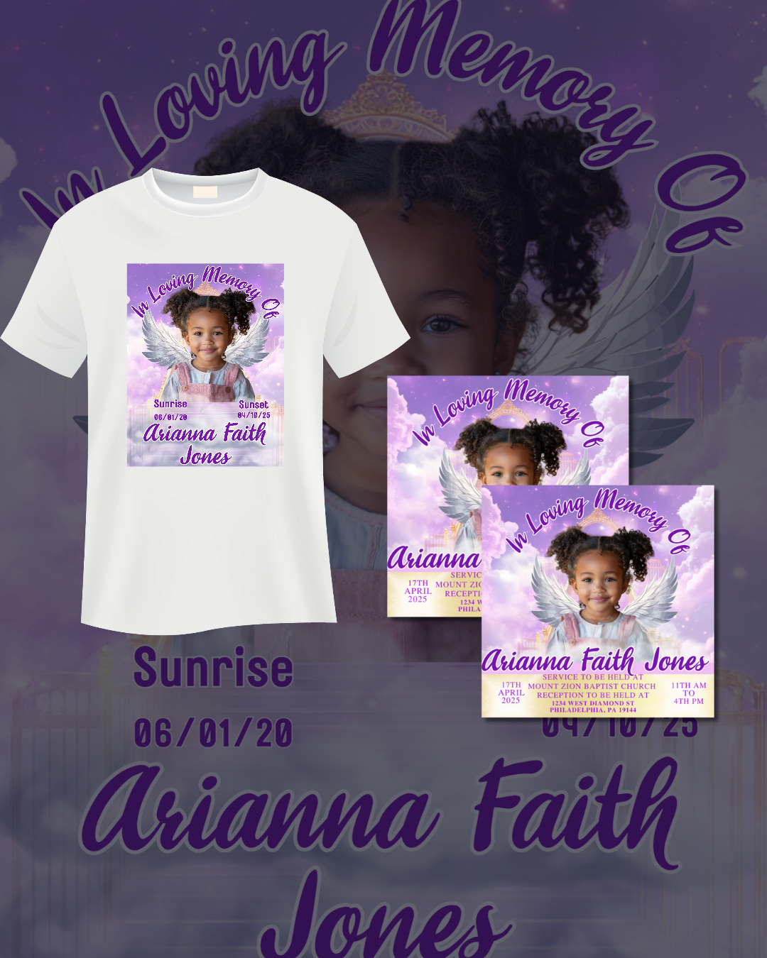 Purple & Pink Memorial Bundle – T-Shirt & Funeral Card Template | Canva Pro Required