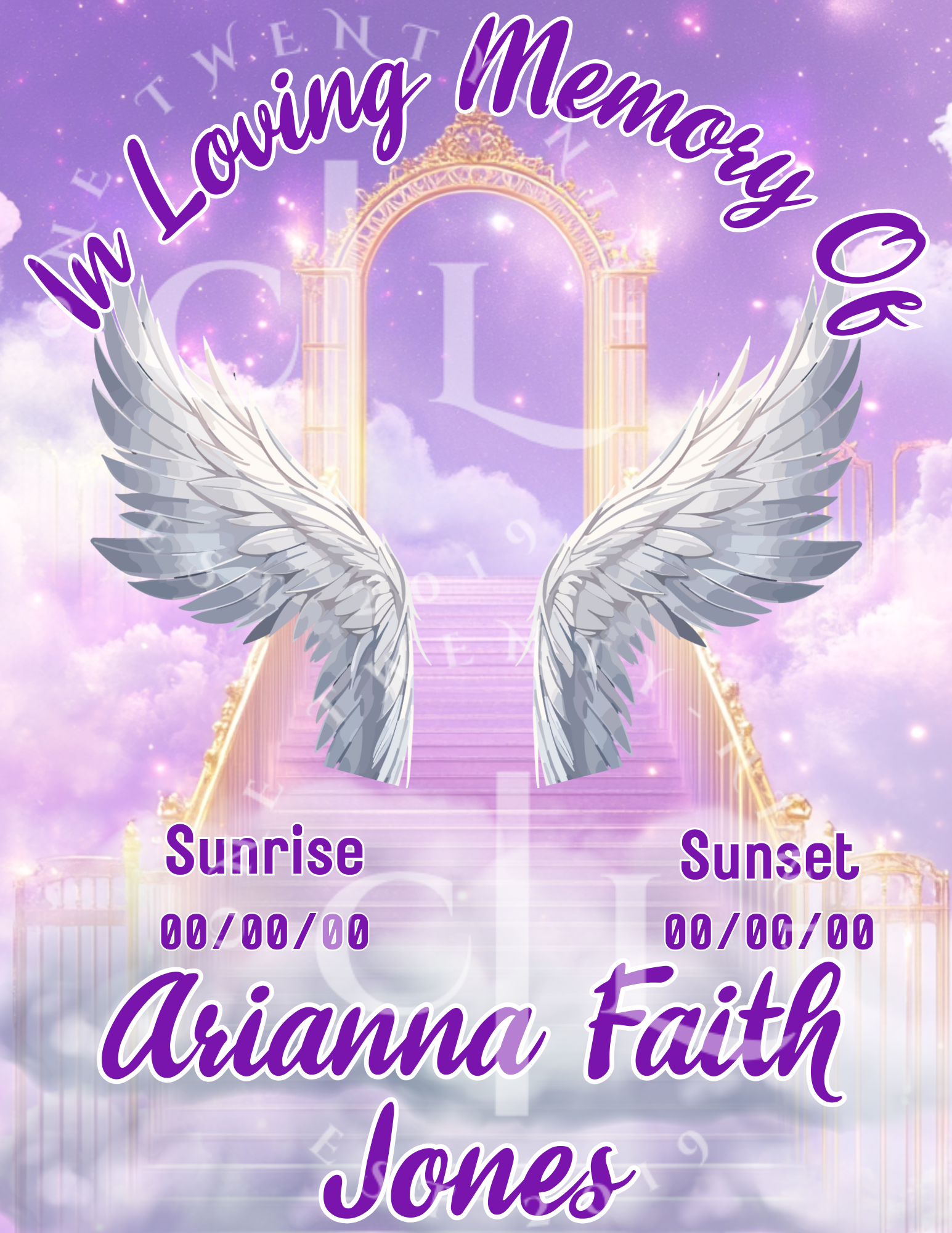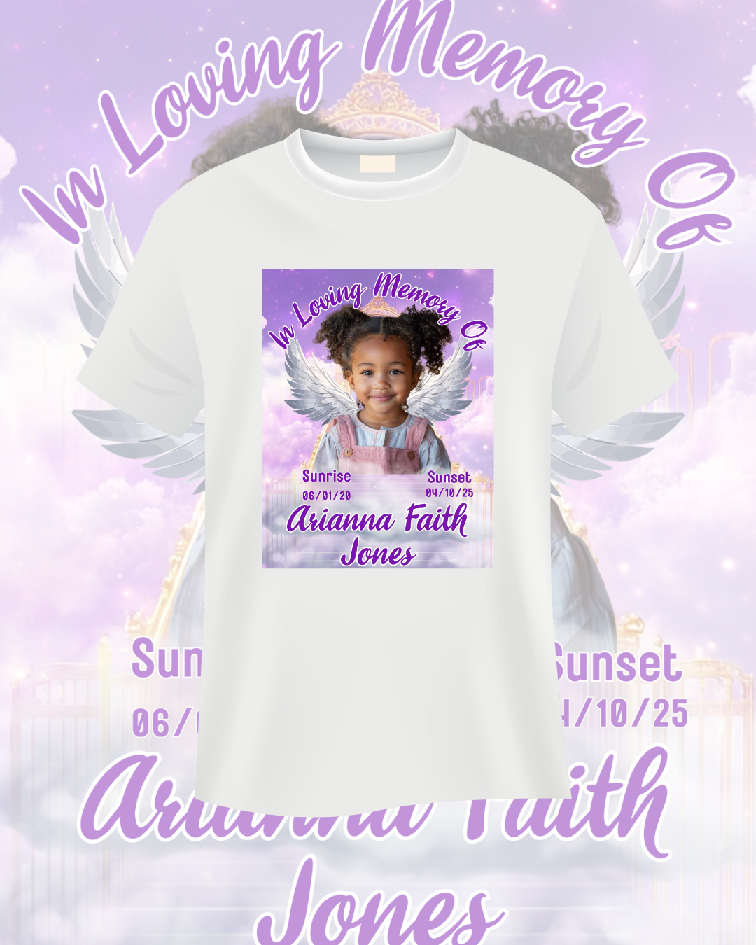 Honor your loved one with this Purple Memorial T-Shirt Template. Fully editable in Canva Pro, customize names, dates, and photos to create meaningful memorial shirts for services or keepsakes.