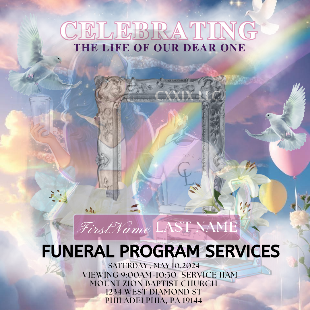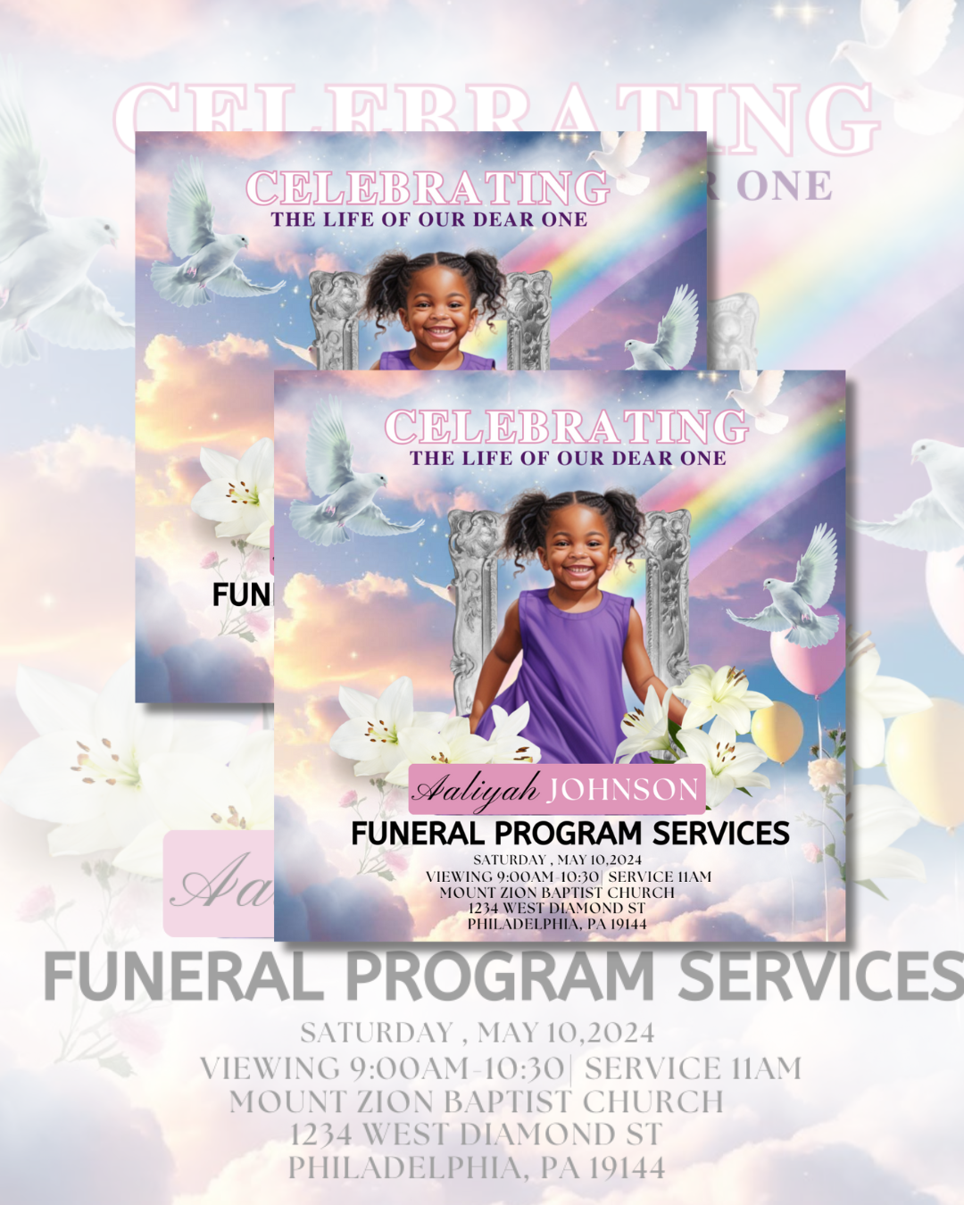 Create a meaningful Rainbow Purple & Blue Funeral Card with this editable Canva Pro template. Perfect for memorial services, celebration of life, or keepsakes.