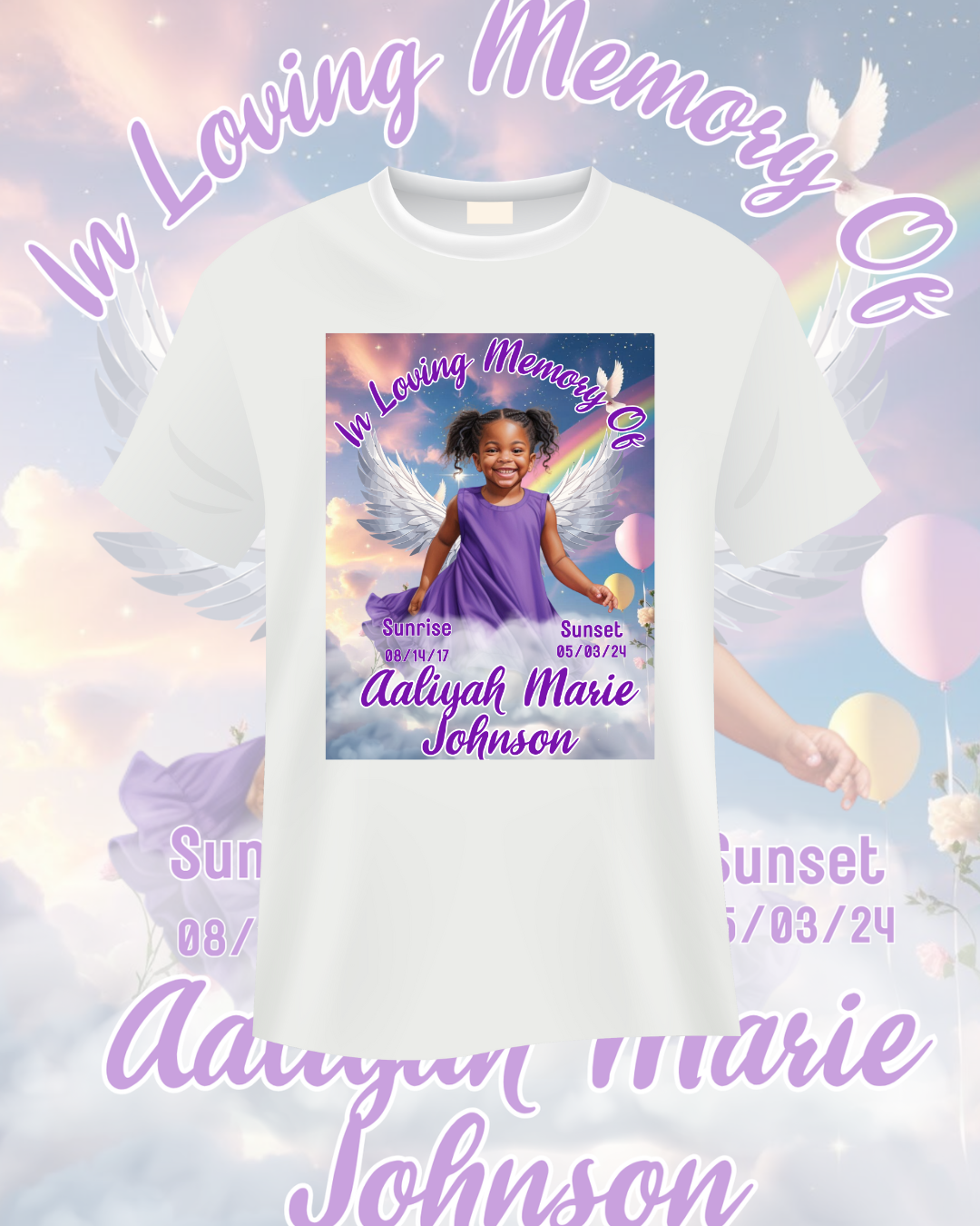 Celebrate your loved one with this Rainbow Purple & Blue Memorial T-Shirt Template. Fully editable in Canva Pro to customize names, dates, and photos for memorial services or keepsakes.