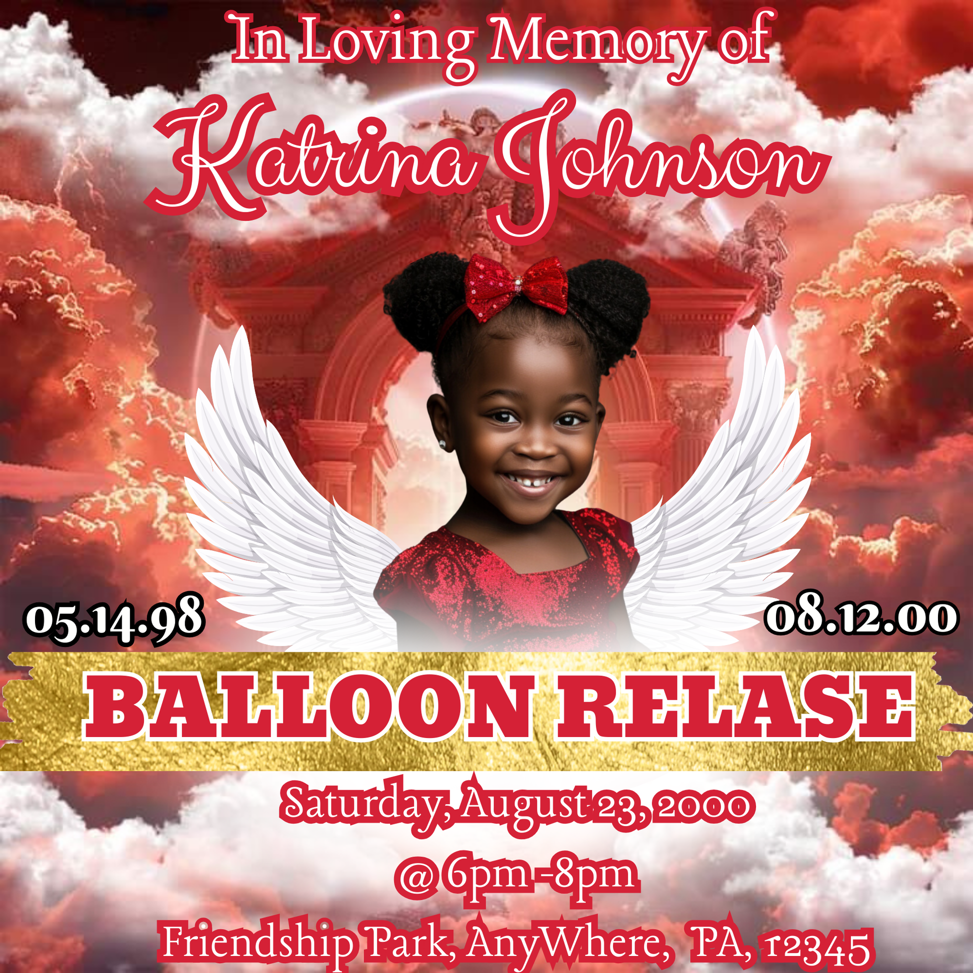 Honor your loved one with grace and beauty using this elegant Red & Gold In Loving Memory Balloon Release Template. Designed with a rich red background and luxurious gold accents, this editable template is perfect for memorial services, balloon releases, or celebration of life events. Personalize it with your own photos, names, and dates to create a heartfelt tribute that reflects the love and light your loved one brought into the world.