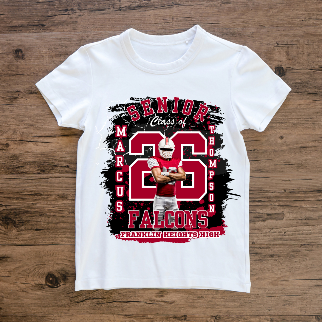 Turn up the spirit with this bold Senior Class of 2026 football design in red, white, and black. Perfect for shirts, hoodies, and team gear.