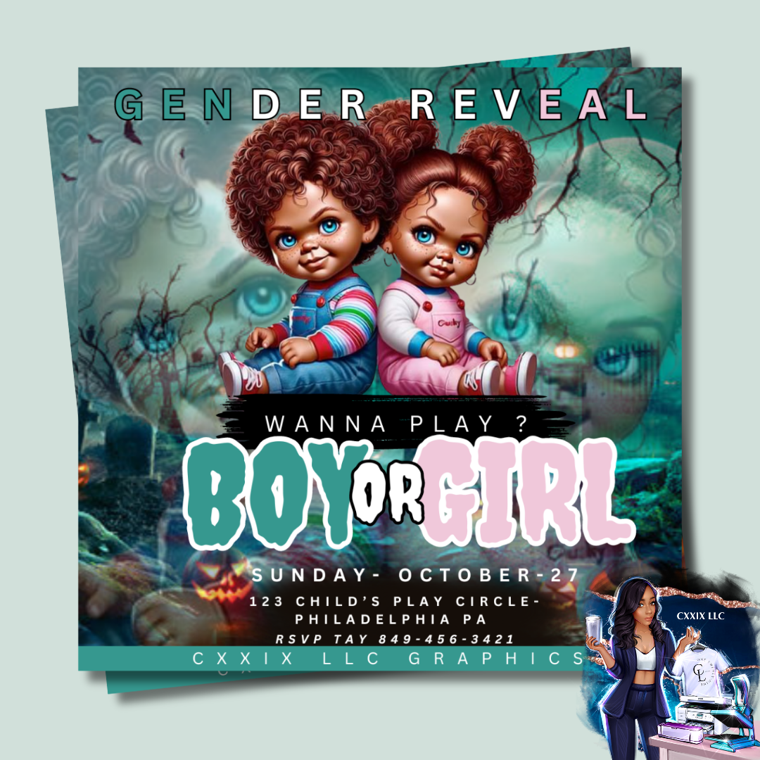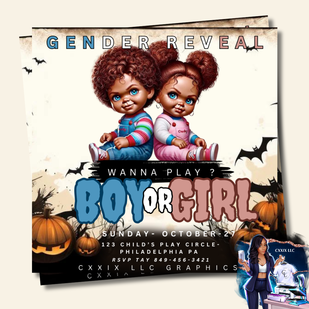 Wanna Play? Gender Reveal Invitation Bundle – Halloween Edition (Tan, Purple & Turquoise)